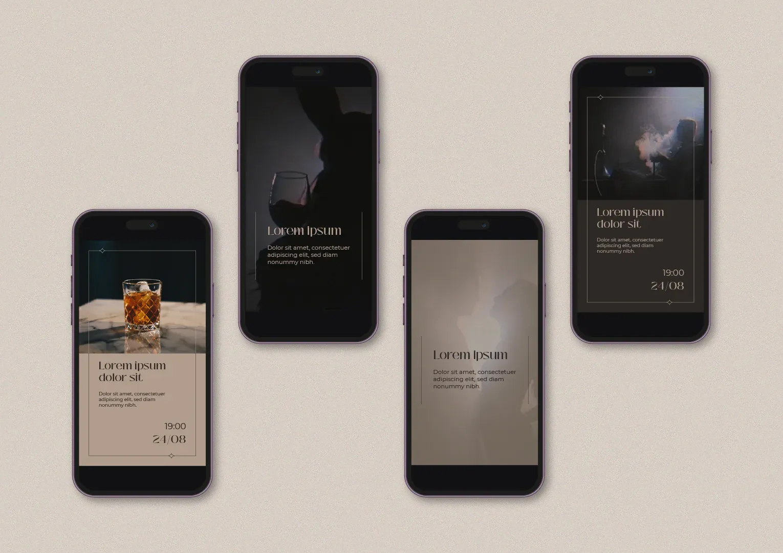 The creative brief centred on a specific emotional register: sophisticated but sensuous, modern but intimate. Not the bold, high-energy visual language common in the bar and nightlife sector, but something quieter and more considered, a brand that rewards attention and appeals to an audience that values atmosphere as much as the drinks themselves.